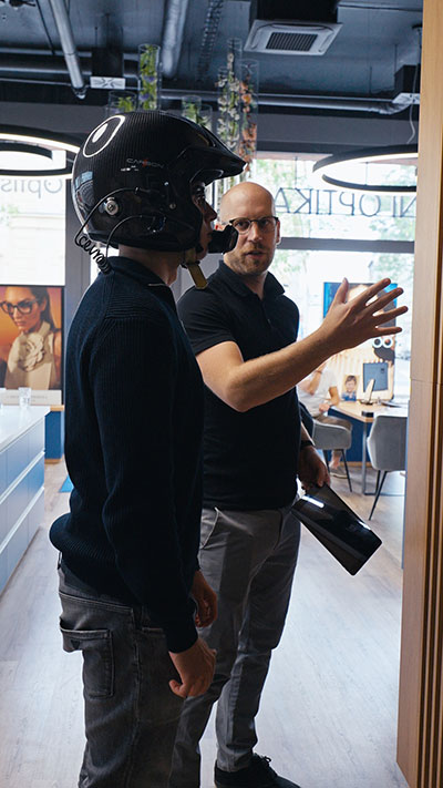 Filip potřeboval čtyři různé páry brýlí, každý pro jinou situaci. Dva pro závodní vůz do helmy, další na tiskové konference a veřejná vystoupení, a čtvrtý na každodenní fyzický trénink. A my jsme věděli, že u každého páru musíme myslet hlavně na funkčnost, ale i pohodlí i styl. Všechno muselo padnout jako ulité, stejně jako závodní kombinéza.